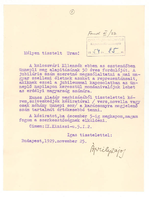 Áprily Lajos levelezőlapja Babits Mihályhoz